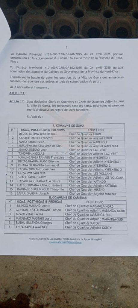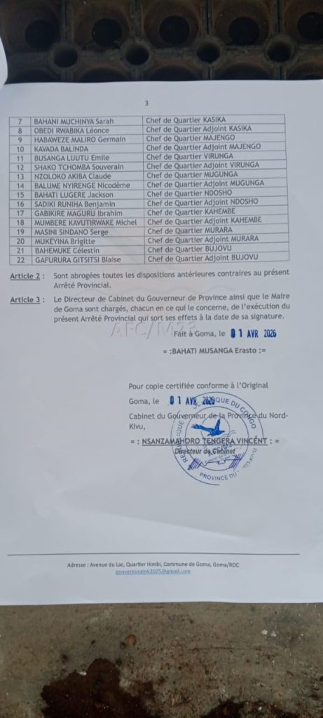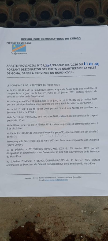 » L’arrêté provincial no 01/011/CAB/GP-NK/ du 1er Avril 2026 portant désignation des chefs de quartier de la ville de Goma, (…), en vue de doter les quartiers de la ville de Goma des animateurs capables de répondre aux enjeux actuels de consolidation de paix« , lit-on sur le présent arrêté.