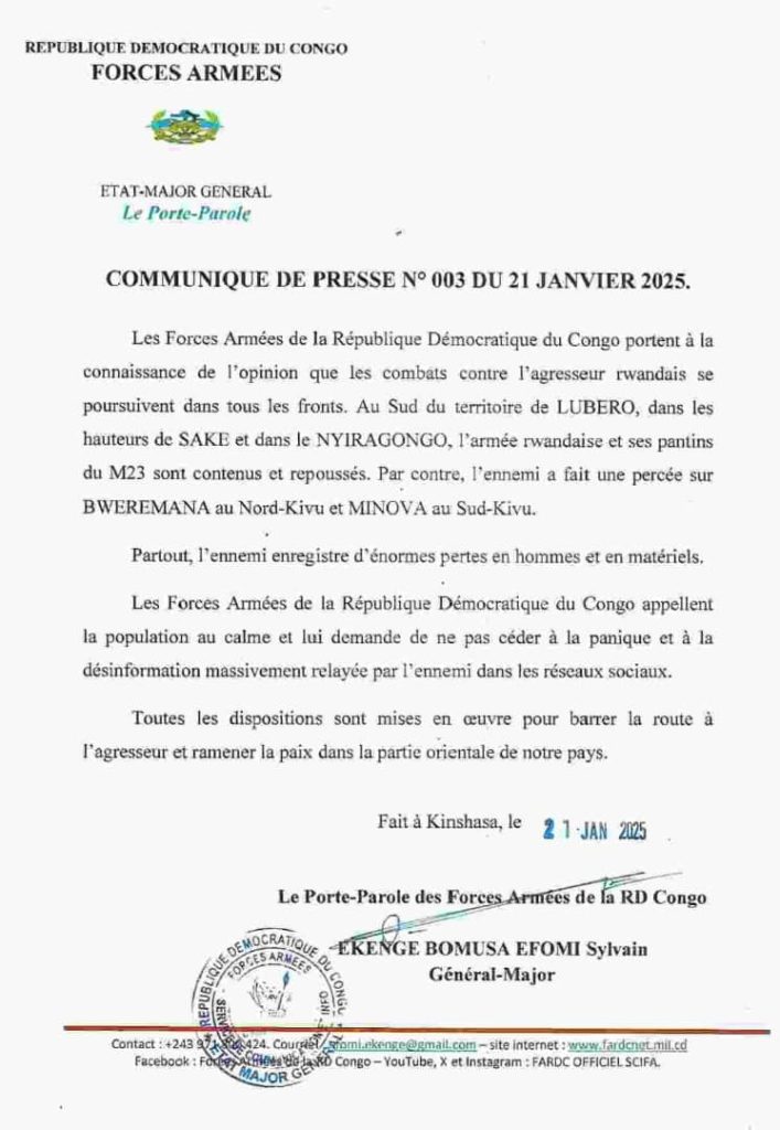 Selon le communiqué de presse signé par le porte-parole de l’armée, le général major Ekenge Sylvain, ce mardi 21 janvier 2025, au sud du territoire de Lubero, dans les hauteurs de Sake et dans le Nyiragongo, l’armée rwandaise et ses alliés du M23 sont contenus et repoussés.